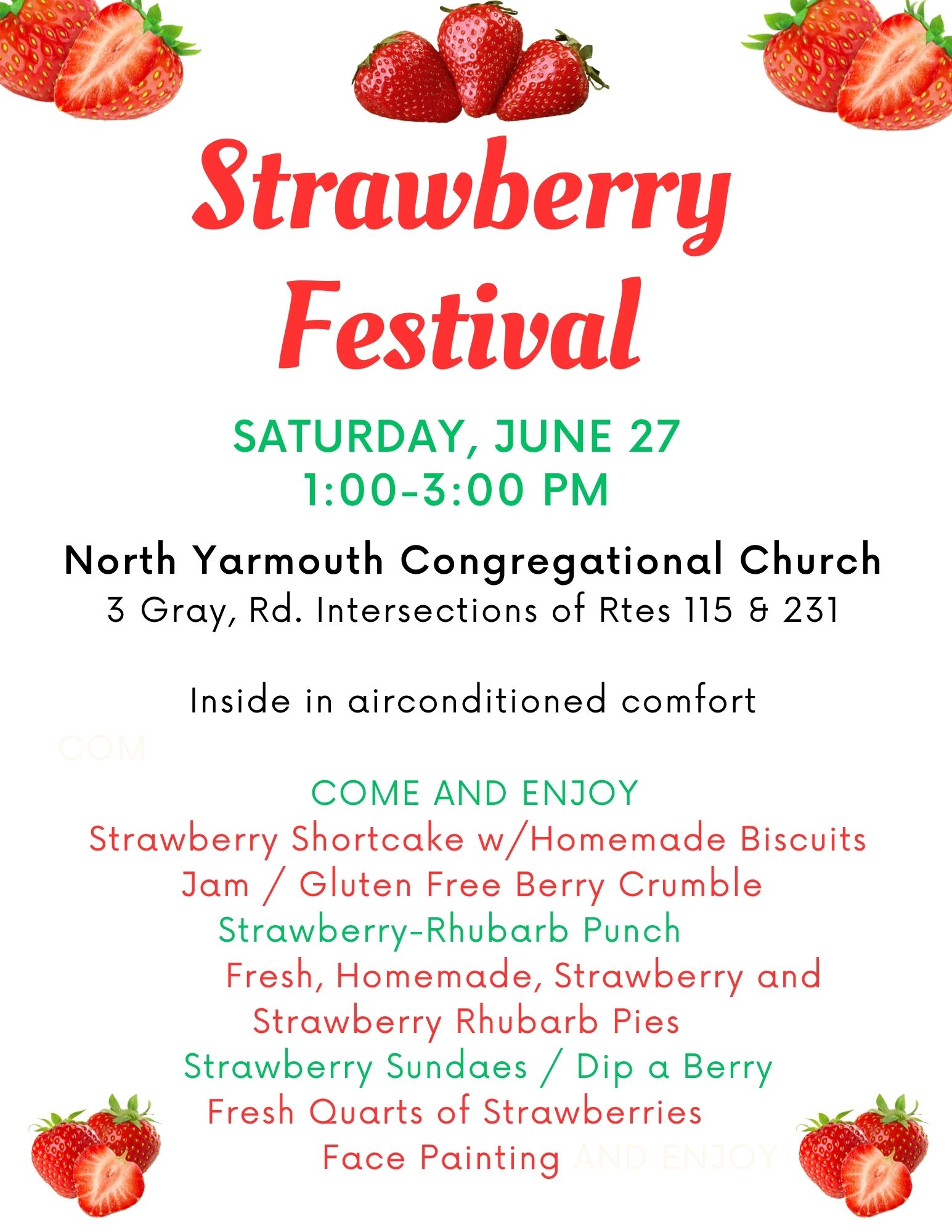 You are invited to the 31st Annual Strawberry Festival on Saturday, June 27, 1-3 pm, being held indoors at North Yarmouth Congregational Church, 3 Gray Rd, North Yarmouth. Come and enjoy delicious strawberry shortcake with homemade biscuits, homemade strawberry and strawberry-rhubarb pies, strawberry-rhubarb punch, ice cream sundaes, Dip-A-Berry, and jam. There will be face painting and freshly-picked quarts of strawberries can also be purchased. There will be seating in the air-conditioned Fellowship Hall and outdoors, picnic-style.
